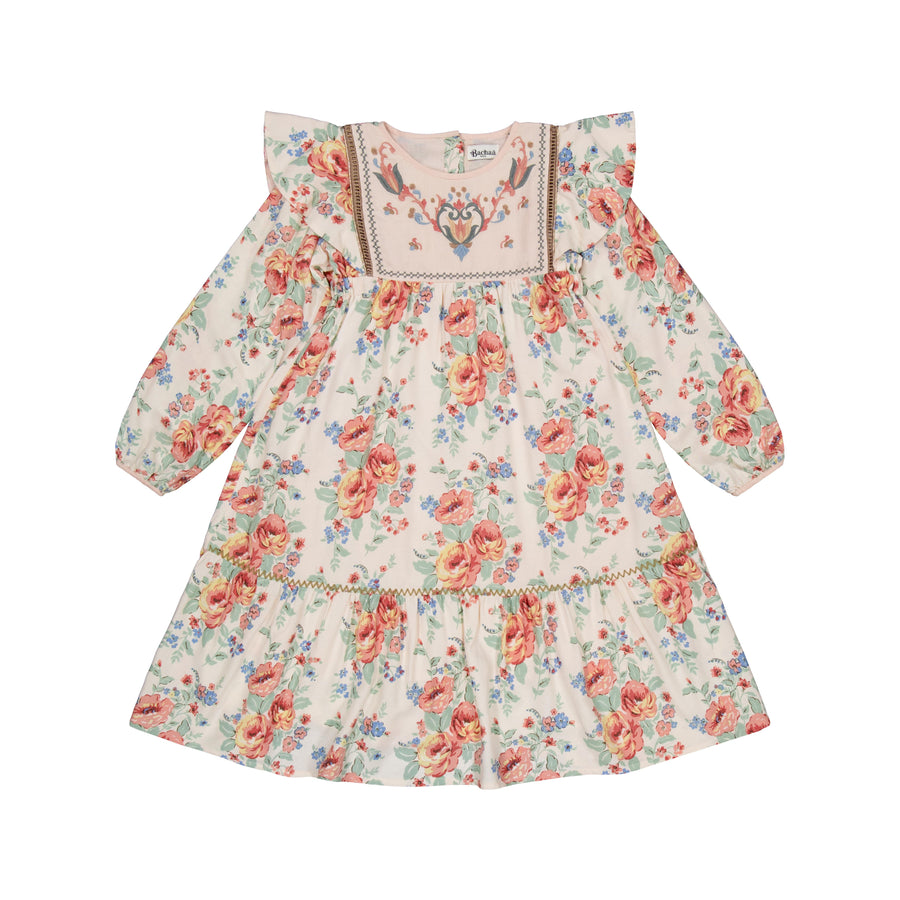 Details: Long dress, 100% ECOVERO® Viscose, Block print, Plain organic cotton voile lining, Embroidery and ladder lace on the front, Golden piping, Long and lined ruffled sleeves, Contrasting buttons and Belt at the back.