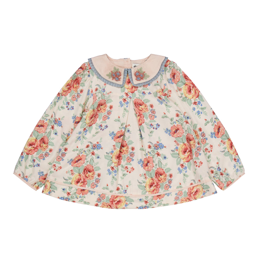 Details: Blouse, 100% ECOVERO® Viscose, Block Print, Hand embroidered and lace trimmed collar, Contrasting collar and tape, Gathers at the front and back, Long elasticated sleeves, Contrasting yoke and buttons at the back.