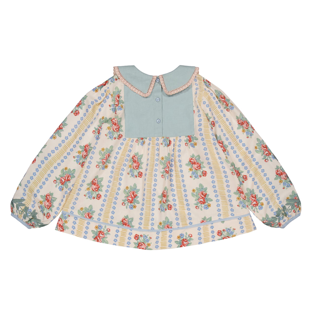 Details: Blouse, 100% ECOVERO® Viscose, Block Print, Hand embroidered and lace trimmed collar, Hand embroidery on the sleeves, Contrasting tape, Gathers at the front and back, Long elasticated sleeves, Contrasting buttons and yoke at the back.
