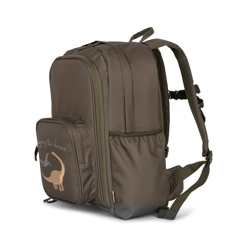 Schoolbag made in 100 percent water repellent recycled polyester. Nush is designed with a solid shape and ergonomic details. The bag features padded adjustable shoulder and sternum straps with easy-to-use buckles. A padded back side and padded pelvic flaps makes the bag comfortable for children to carry. The lightweight bag is designed with two easy to access side pockets for water bottles, one with thermal insulation material inside. The bag features a practical hanger loop and is designed with a small zippered compartment with a removable elasticated rain cover with reflective elements for high visibility and safety. The bag has a spacious main compartment with two elasticated inner pockets, a compartment ideal for paper or I-pad and a front compartment to store the pencil case. All zippers are easy to use, made especially for little hands. Underneath the bag has small solid rubber feet for durable protection.
