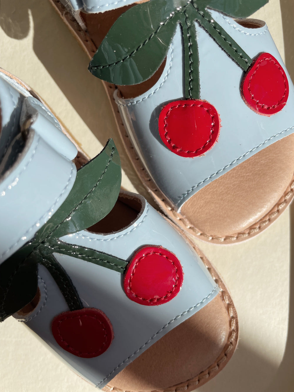 Summer sandal made in leather designed with velcro fastening. Adorned with patent leather cherries.