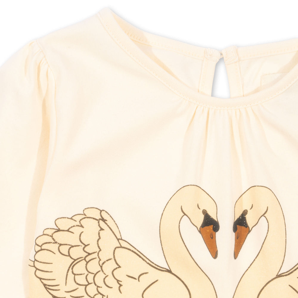 The dress has snap buttons at the legs for easy dressing up to 18 months. Made of 95% organic cotton and 5% elastane with 100% polyester glitter tulle. Lining is made of 100% organic cotton.