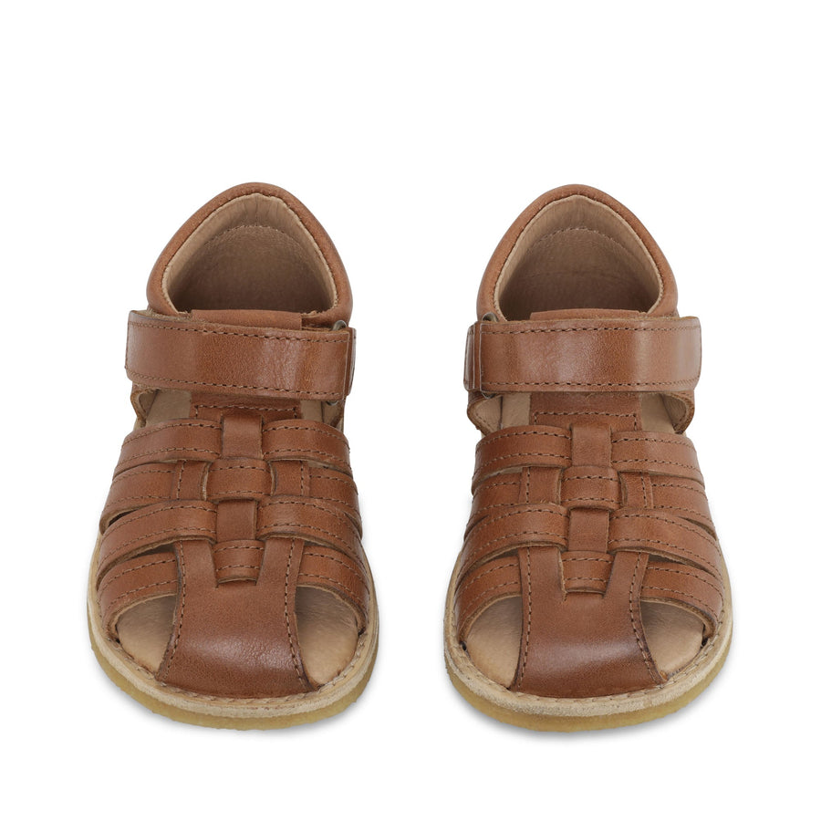Closed toe sandal with basket weave straps and reinforced cushioned heel. Features a padded insole for extra comfort and a natural crepe rubber sole.