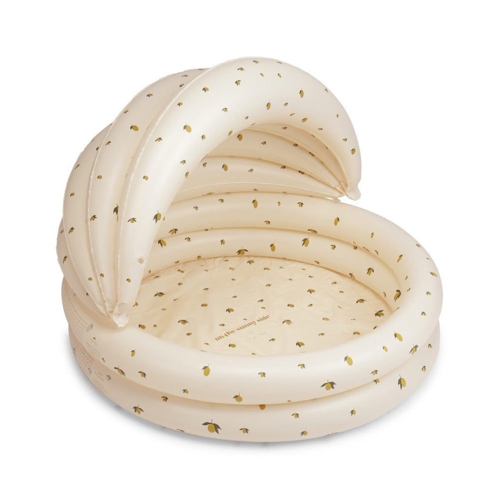 Large inflatable pool made from durable PVC. Designed with a canopy that protects the child from the sun.