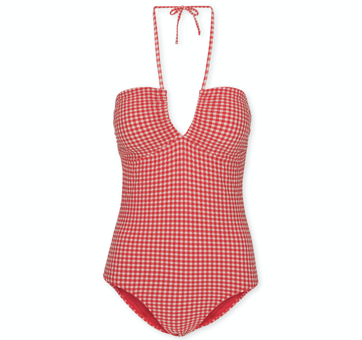Swimsuit made in 48 percent recycled polyester, 44 percent polyamide and 8 percent elastane. Features a back neckline tie fastening that can be adjusted for the perfect fit. Designed with removable bust pads and a soft seersucker effect.