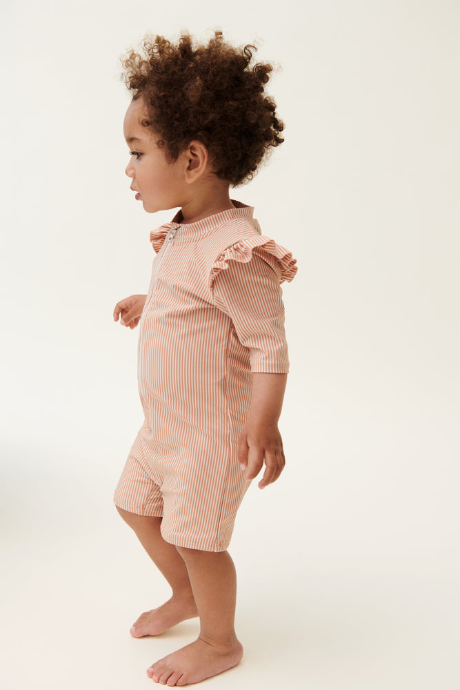 SWIM JUMPSUIT WITH RUFFLE DETAIL Protective and playful at once, the Amel swim jumpsuit marries UV protection while swimming with decorative details for an extra special look. Made from quick drying recycled polyester and with zipper in the centre front for easy changing.