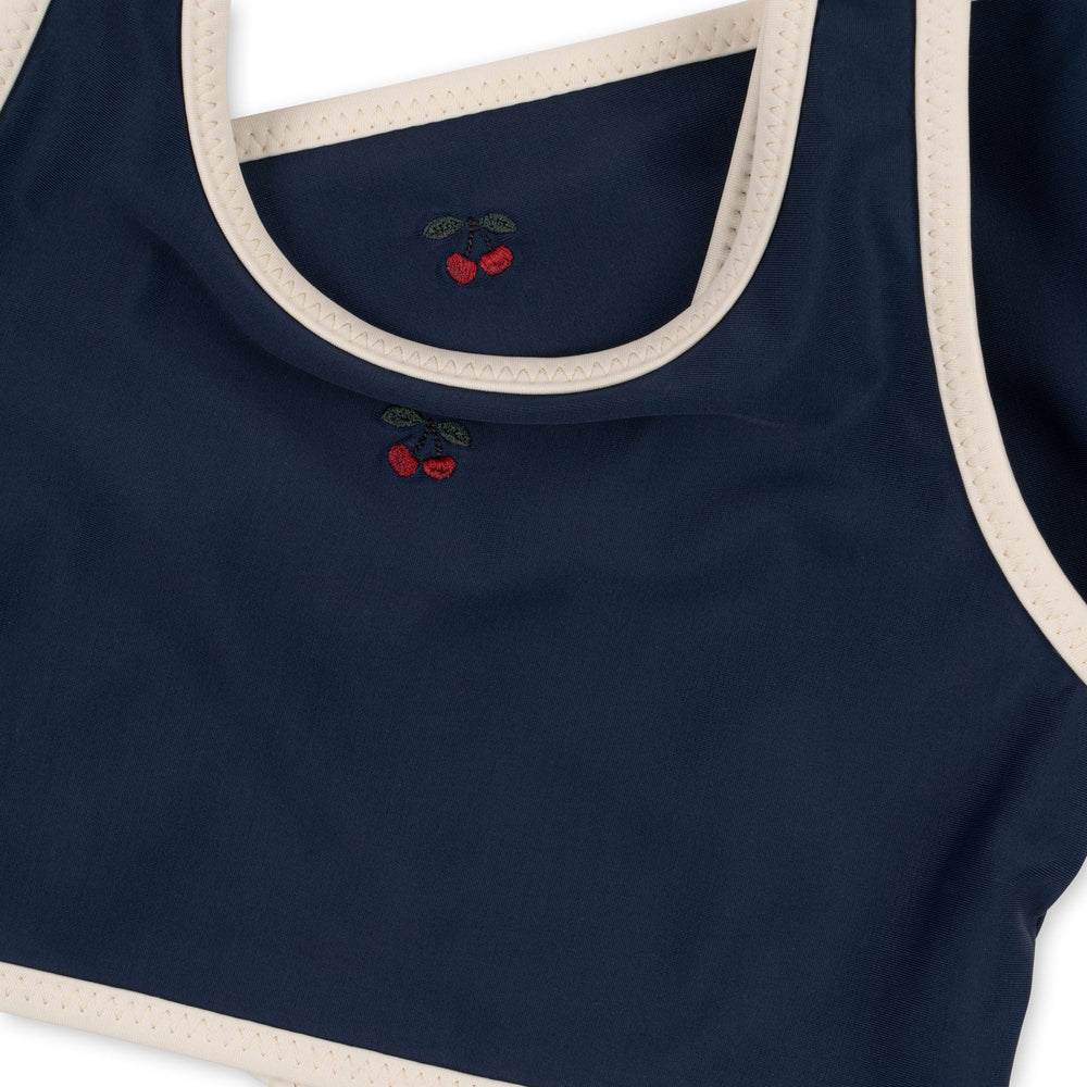 Classic style bikini made in 80 percent recycled polyester and 20 percent elastane. Features an embroidered cherry on both top and bottom.