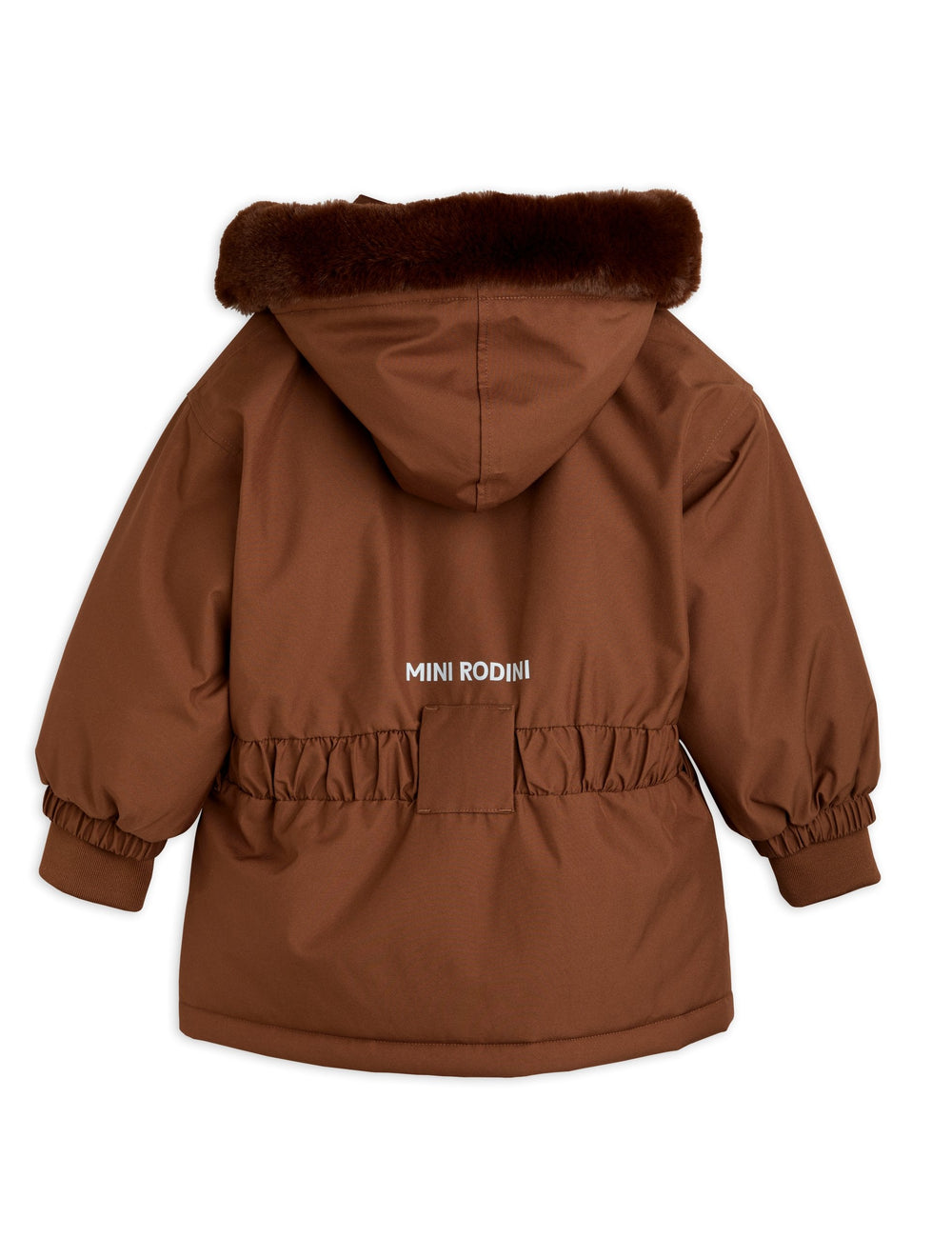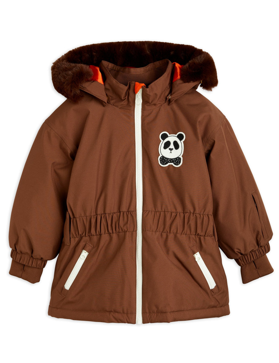 Brown heavy duty wind- and waterproof jacket for city, snow and skiing, made from 100 % recycled polyester. Designed with a cozy faux fur collar and a hidden ski pass pocket in the sleeve. Finished with a Mini Rodini Panda Patch on the chest and a reflective logo print on the back.