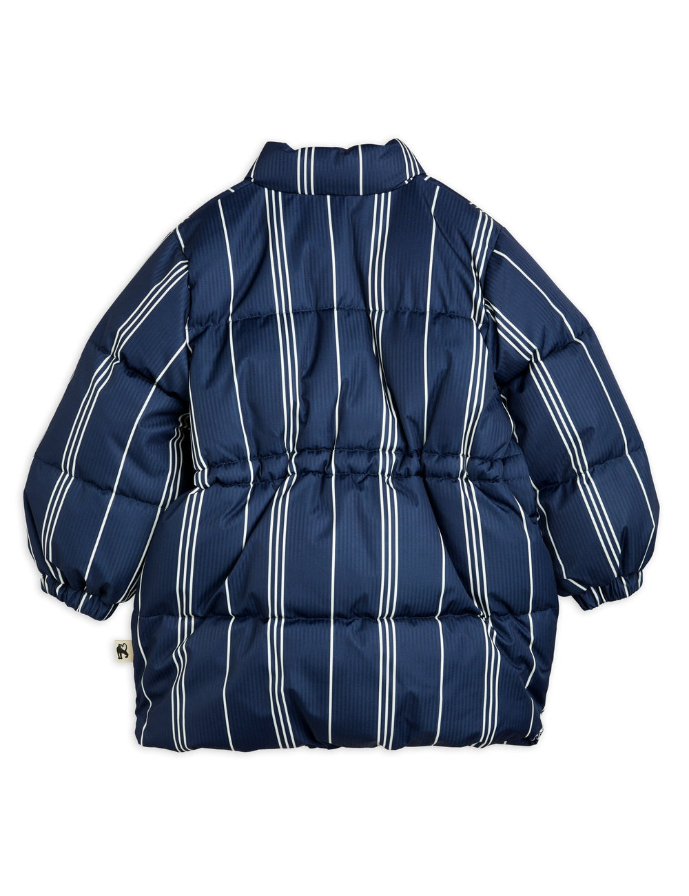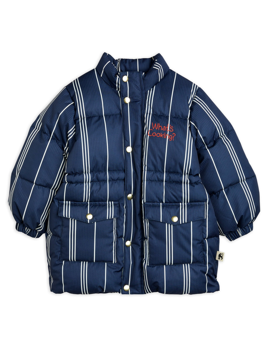 Blue water repellent and windproof heavy puffer jacket with pinstripes and an embroidered What's Cooking motif, made from 100 % recycled polyester. Perfect for colder days in the city or at school.• Padded