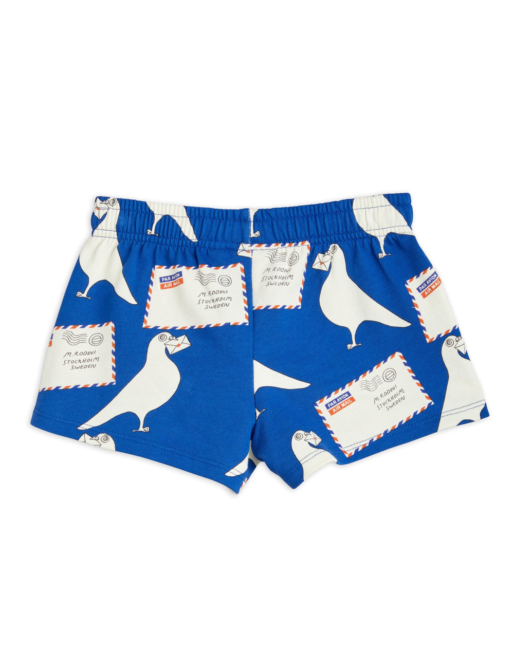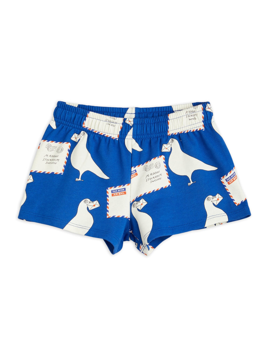 Blue sweat shorts with a dove print throughout, made from 100% GOTS-certified organic cotton. The shorts have a soft, elastic waistband.