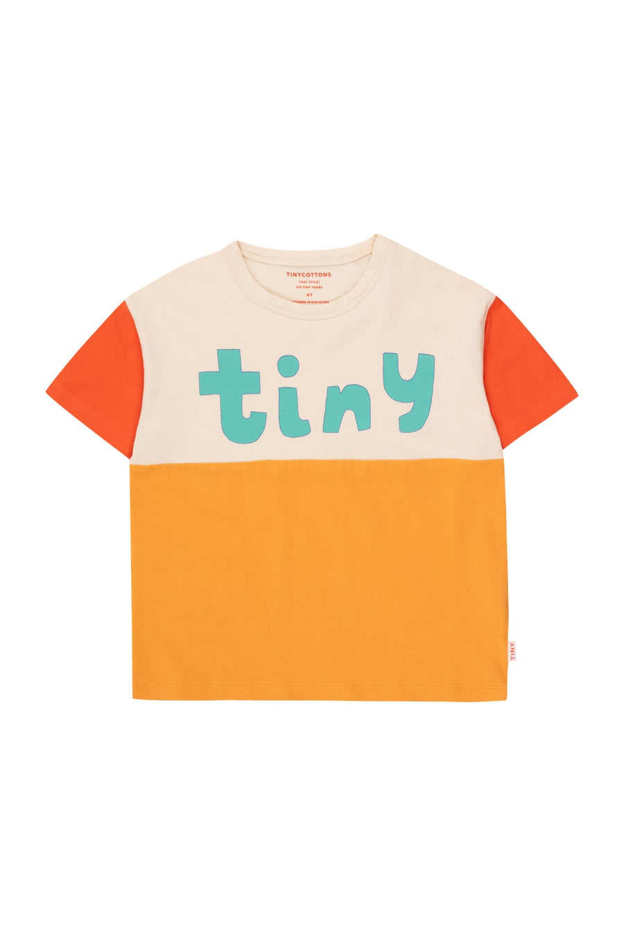 A new style this season, the Tiny Color Block Tee. This organic cotton/elastane tee with bright orange sleeves and an orange and light cream color block body features our tiny slogan in contrast green emblazoned across the front. This statement top will add style and comfort to all of your little one's adventures from park outings to beach sunsets.