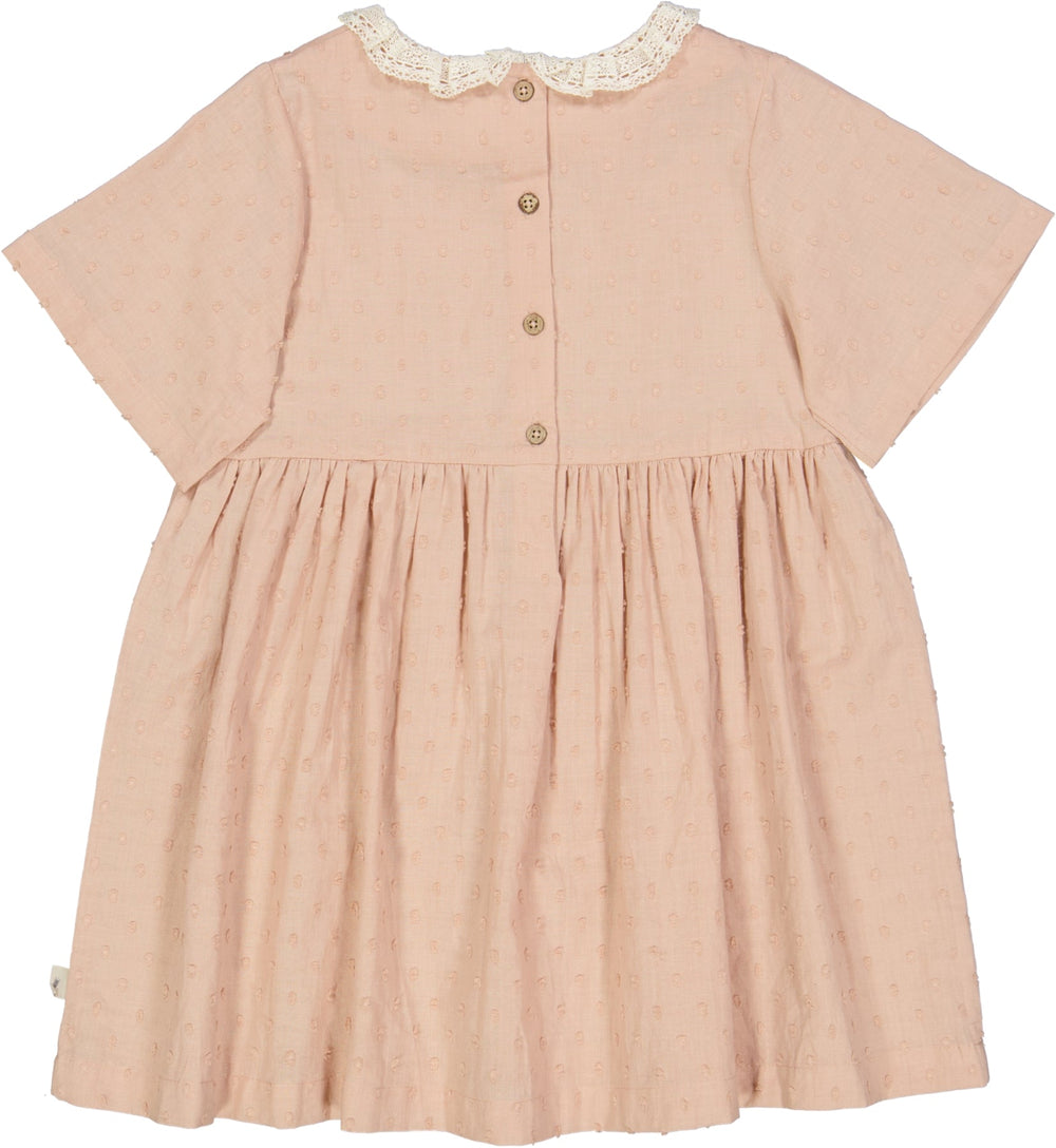 Sweet short-sleeved dotted dress in soft woven organic cotton for the junior child.