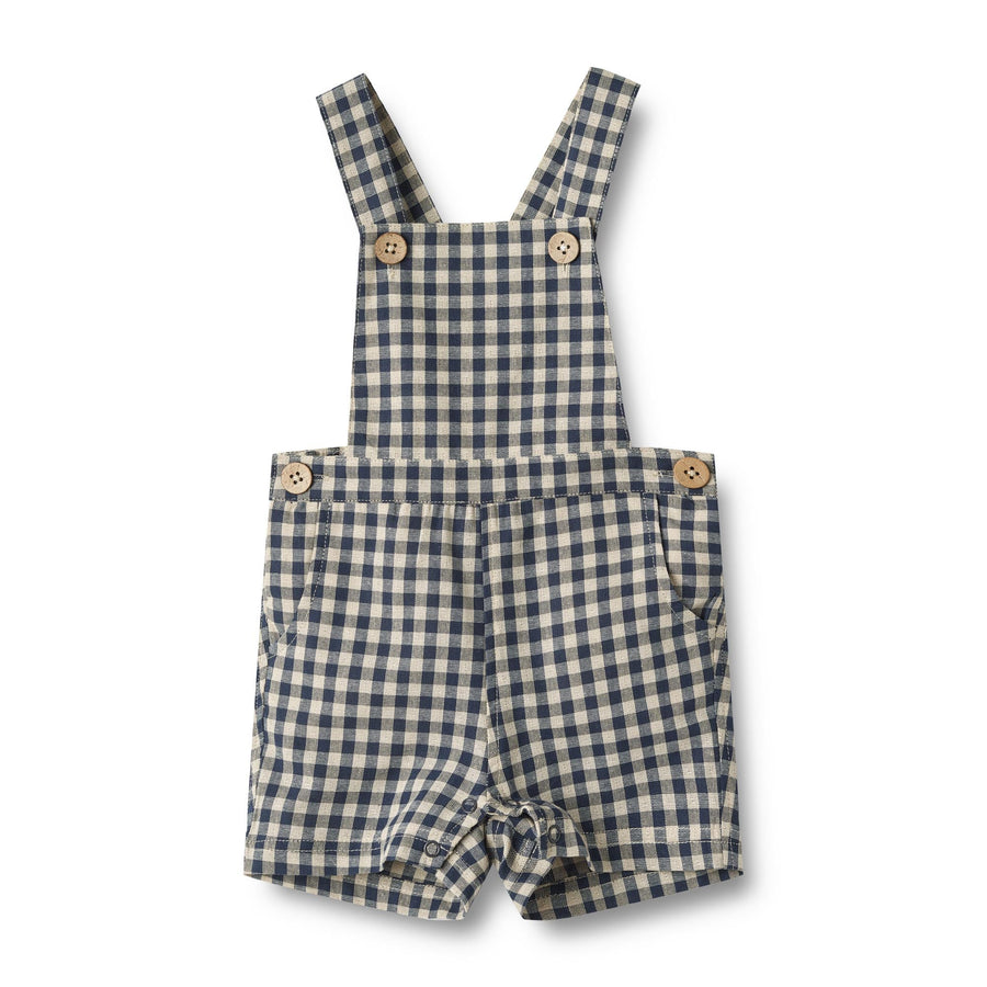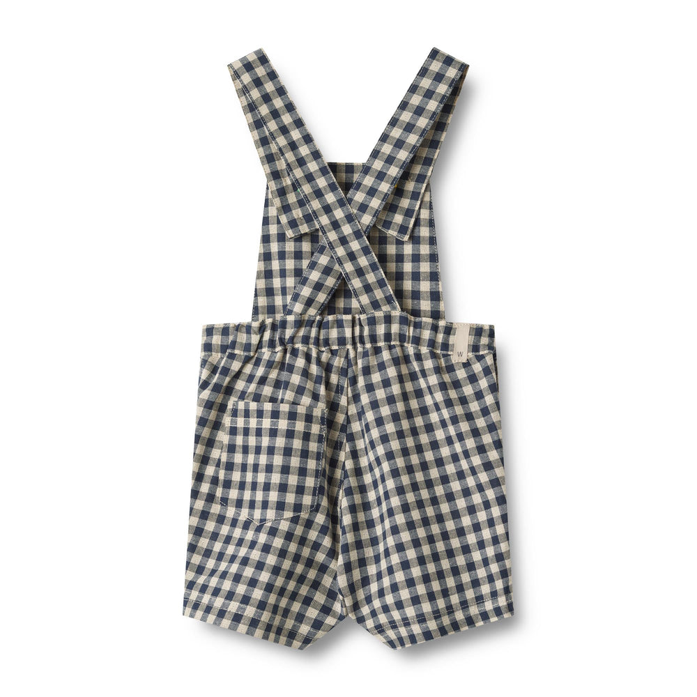 Sleeveless checked overalls with short legs in soft organic cotton for babies.