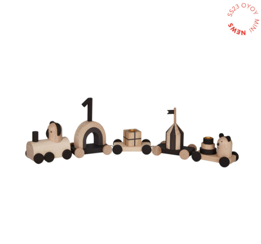 A cute birthday train with numbers and candles to decorate the table for special occasions made of FSC birch wood. The wood is 100% natural colored birch or stained birch. The Birthday Train contains 1 train, 4 wagons and 9 numbers. All wagons can be attached/detached with small hooks in brass finish.