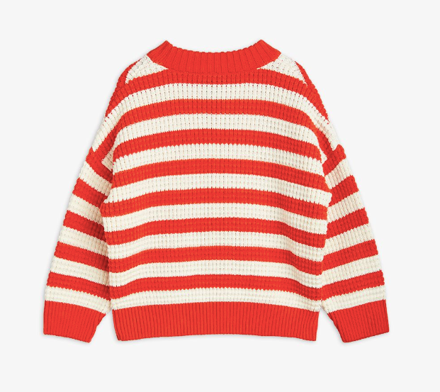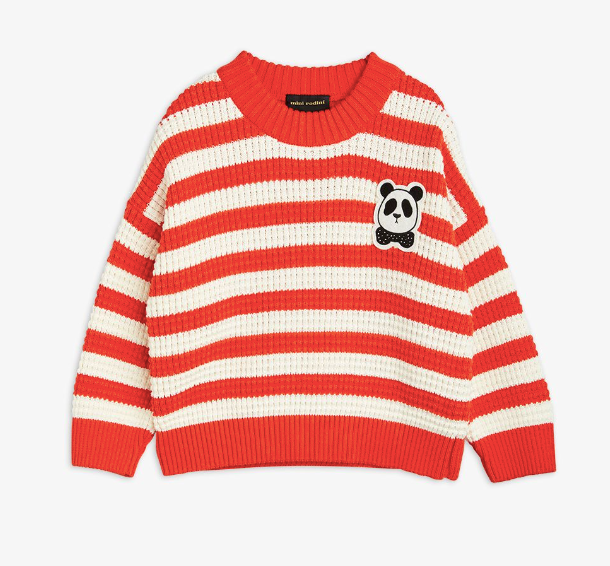 Rot gestreifter Waffelstrickpullover mit aufgesticktem Mini-Rodini-Panda-Aufnäher auf der Brust, aus 100 % GOTS-zertifizierter Bio-Baumwolle. Mit geripptem Ausschnitt, Saum und Bündchen sowie leicht überschnittenen Schultern für eine entspannte Passform.