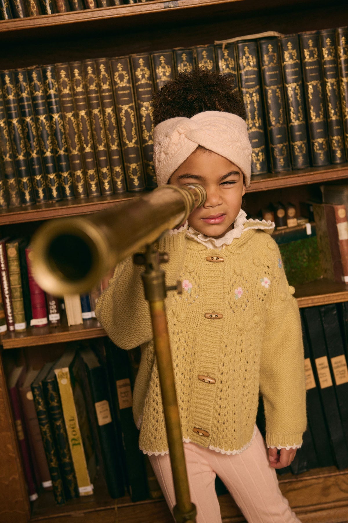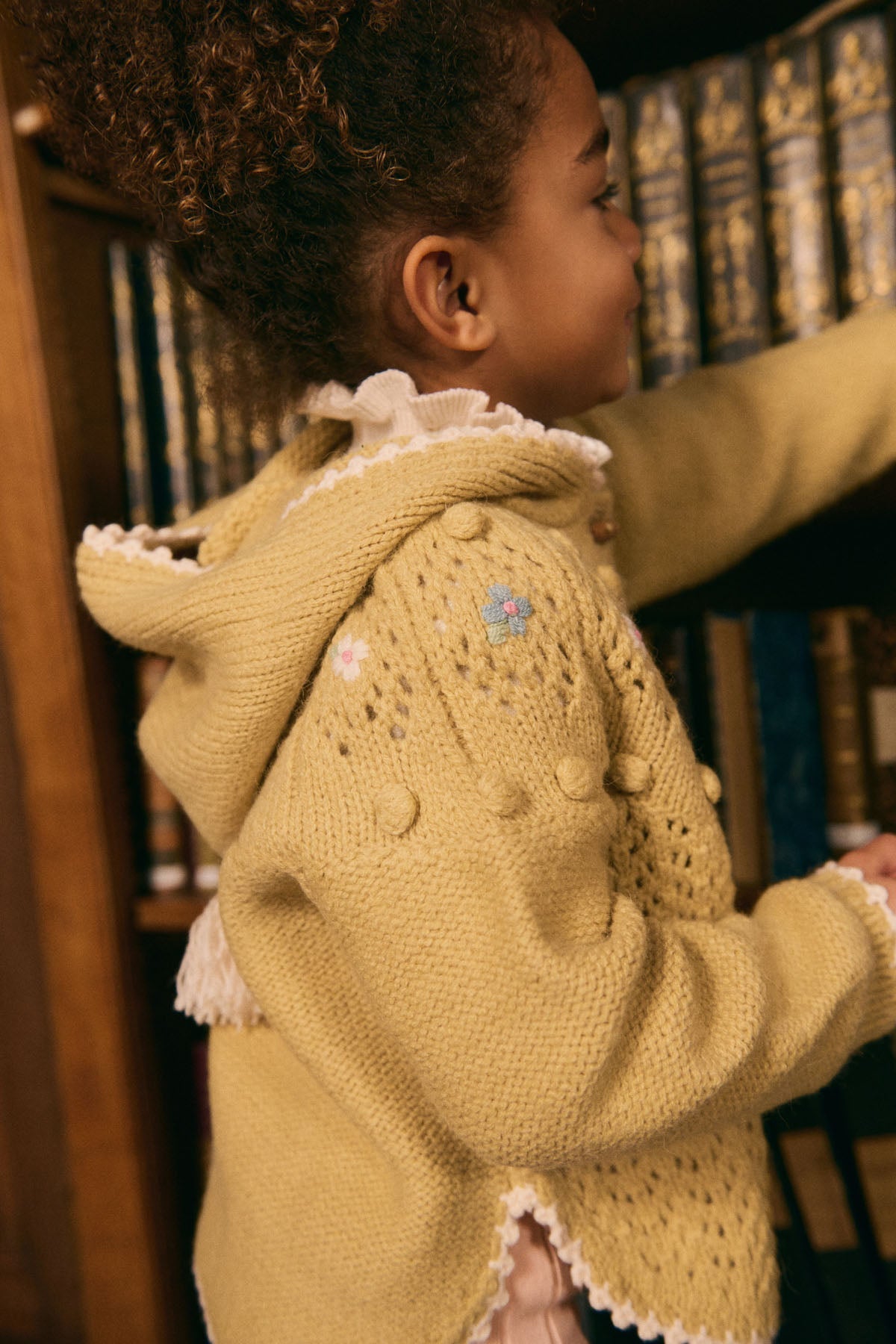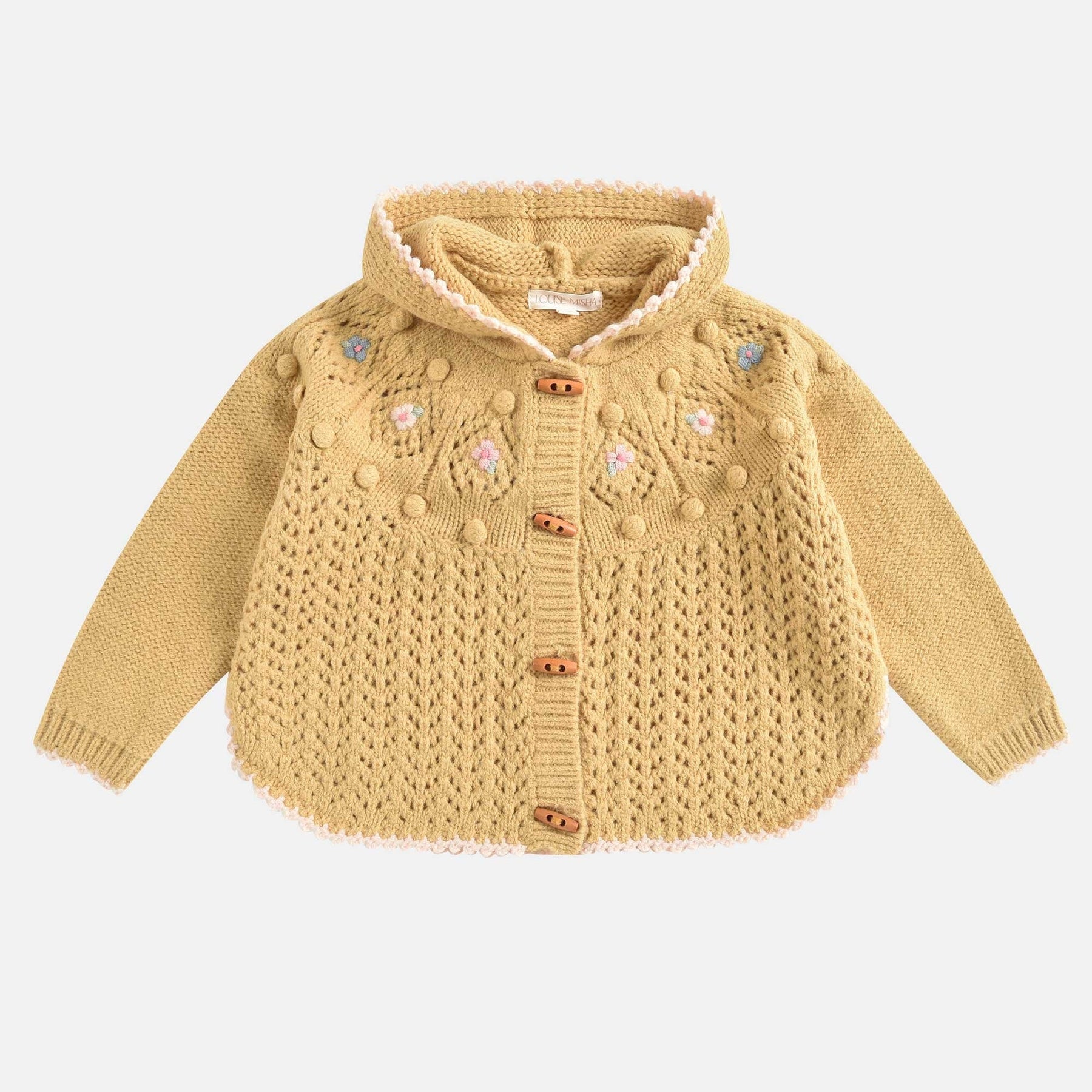 • Hood with hand-crocheted scalloped edges and handmade pompom.