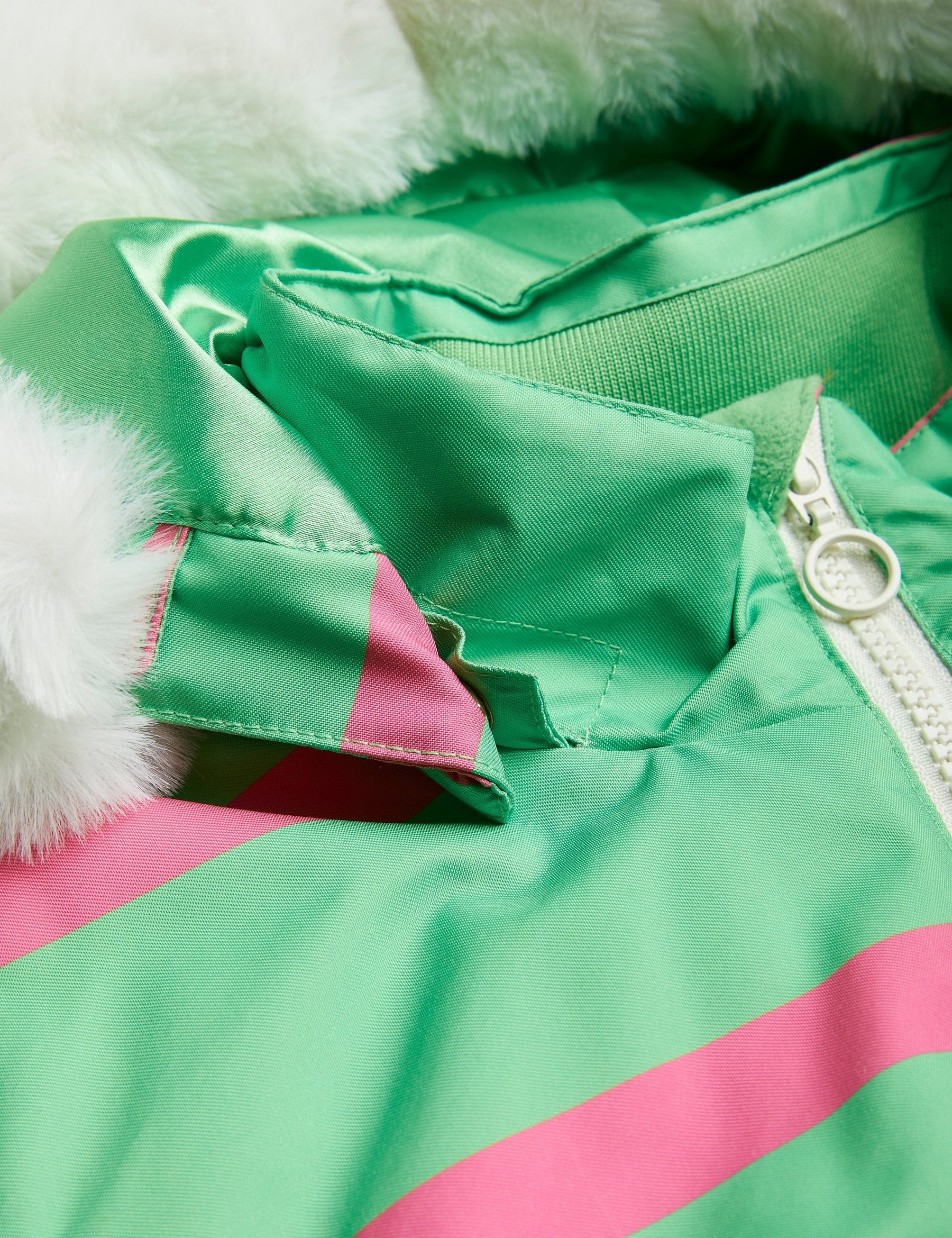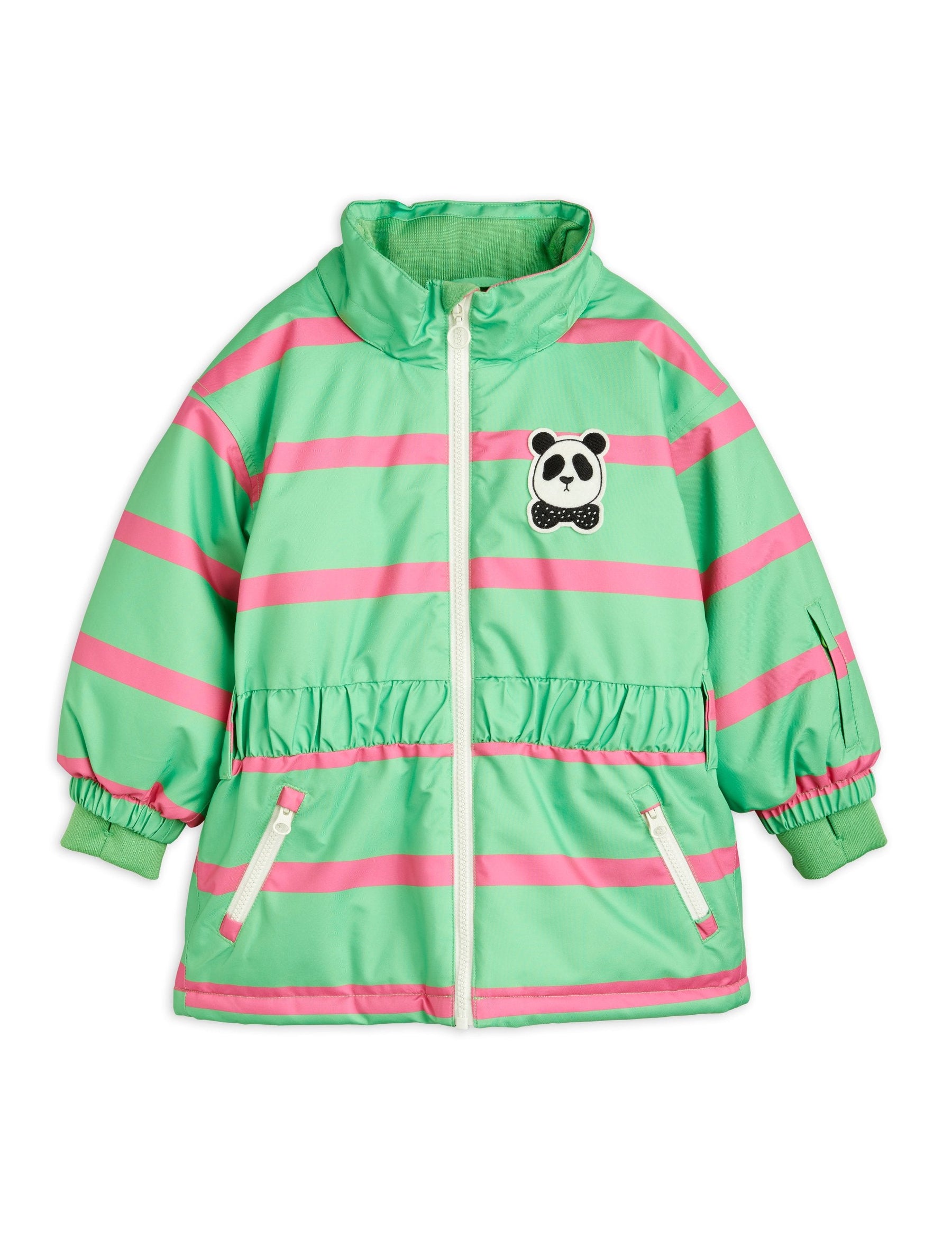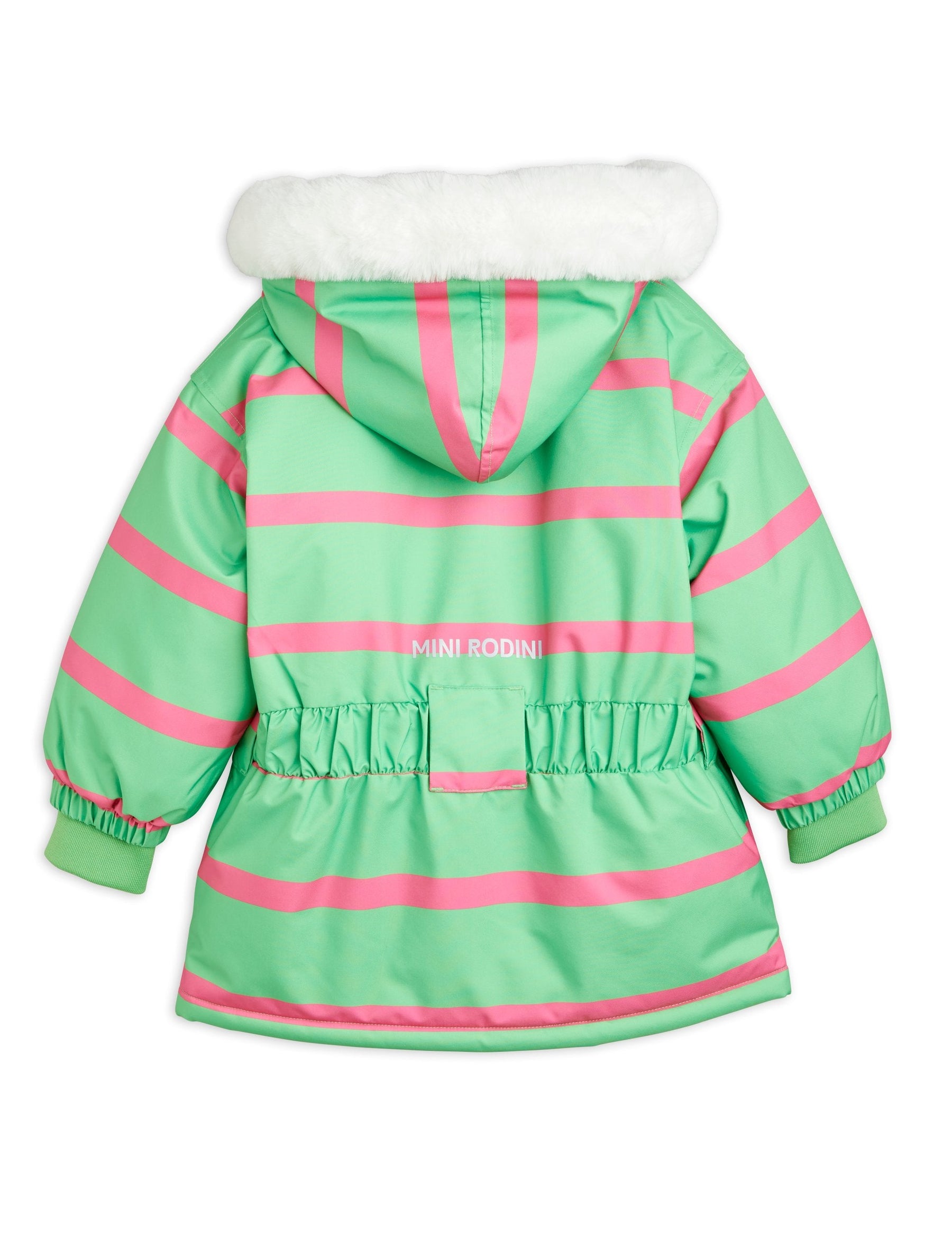 Grüne, strapazierfähige wind- und wasserdichte Jacke mit rosa Streifen für Stadt, Schnee und Skifahren, hergestellt aus 100 % recyceltem Polyester. Mit einem kuscheligen Kunstpelzkragen und einer versteckten Skipasstasche im Ärmel. Abgerundet mit einem Mini Rodini Panda Patch auf der Brust und einem reflektierenden Logo-Aufdruck auf dem Rücken.