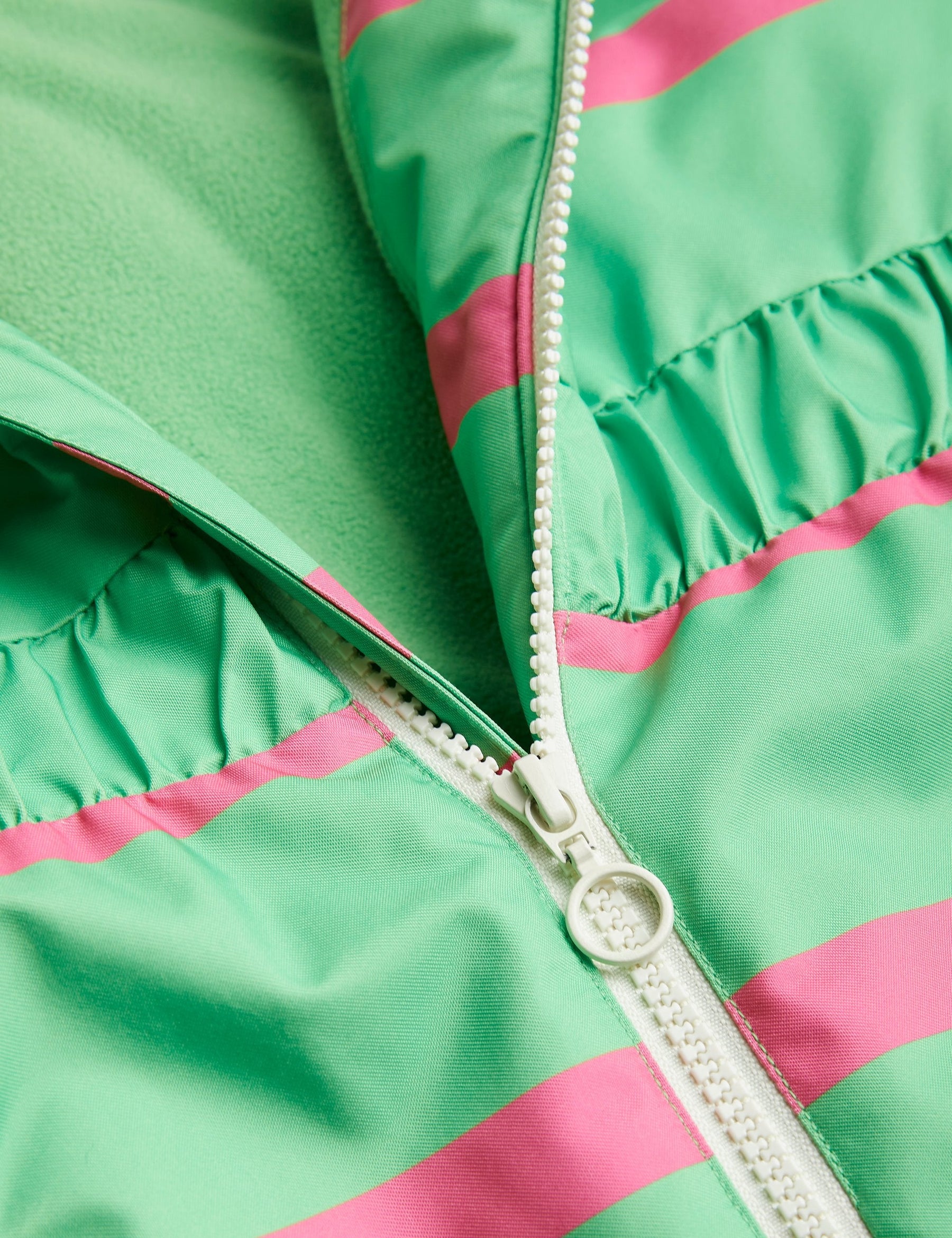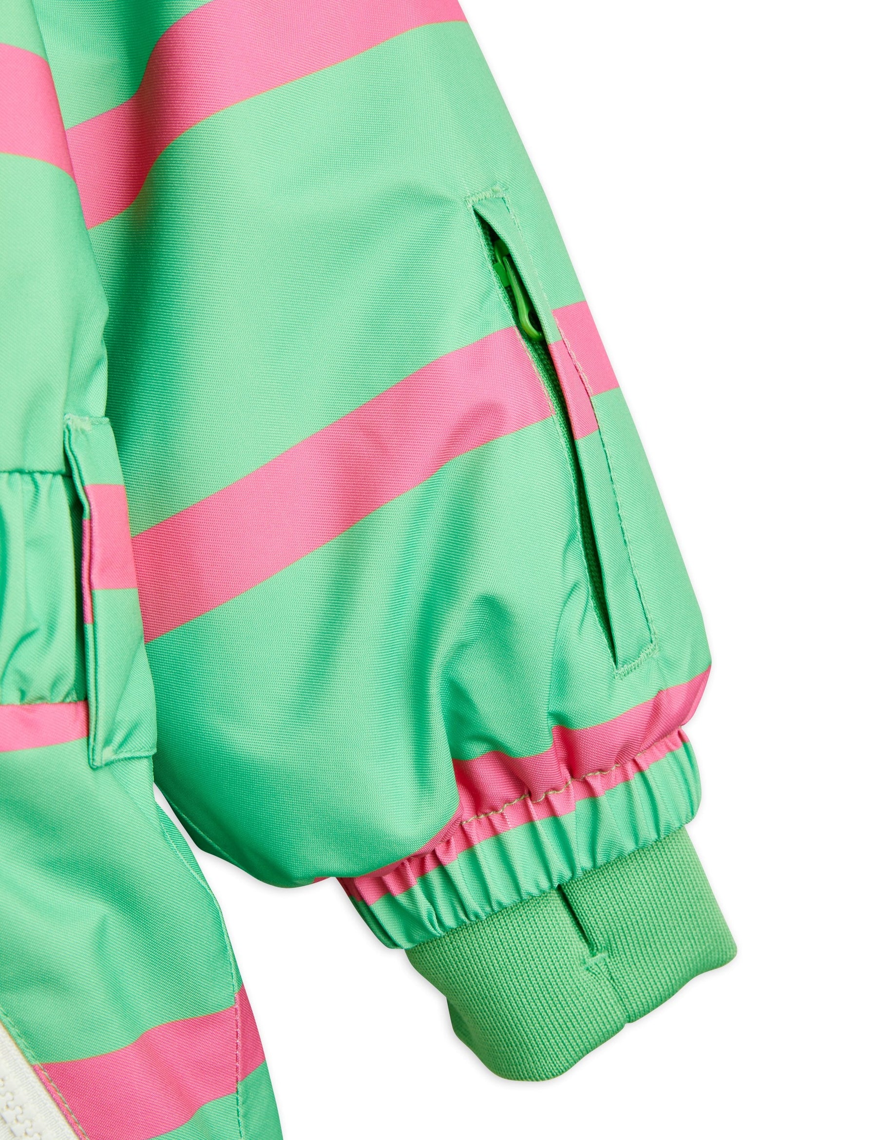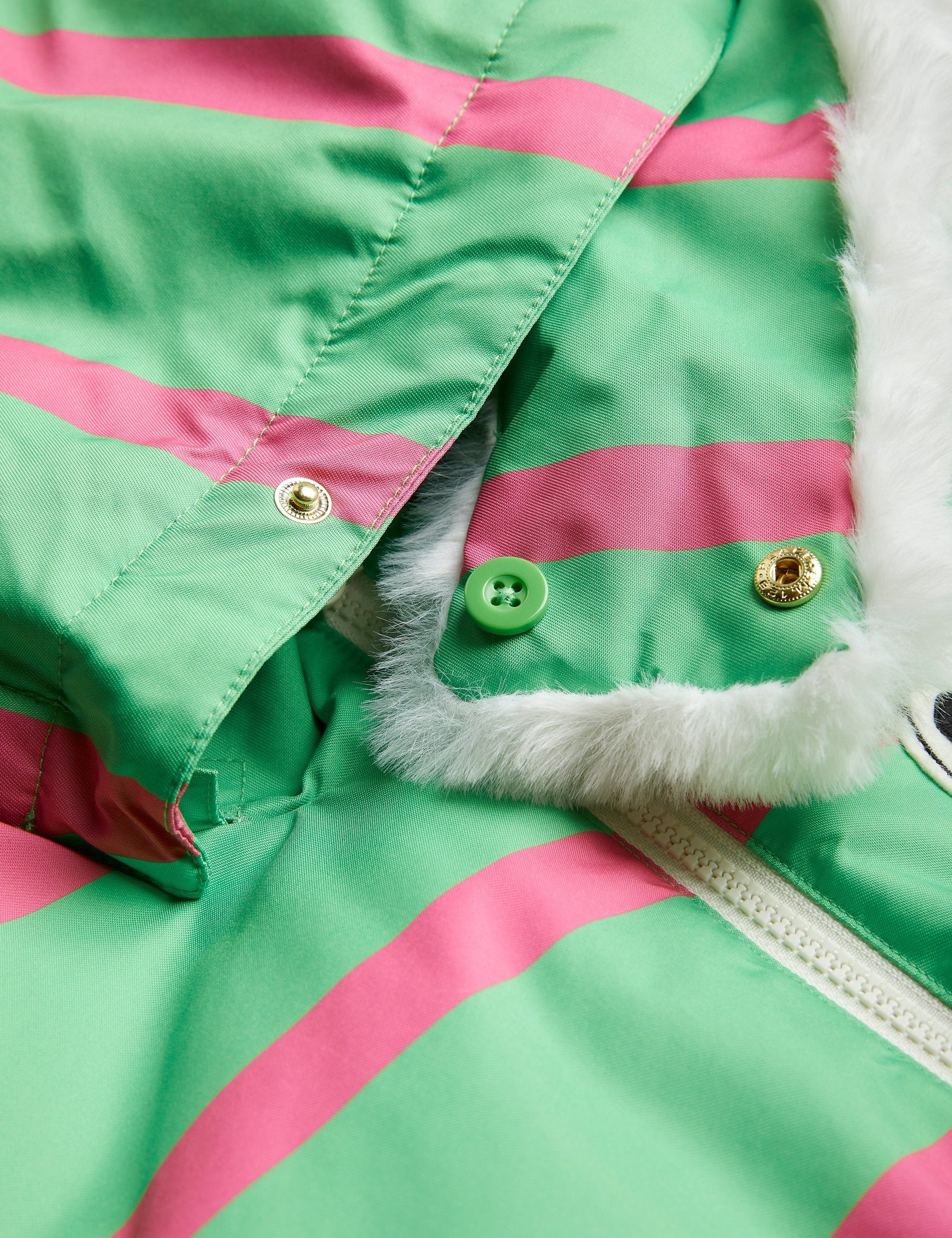 Grüne, strapazierfähige wind- und wasserdichte Jacke mit rosa Streifen für Stadt, Schnee und Skifahren, hergestellt aus 100 % recyceltem Polyester. Mit einem kuscheligen Kunstpelzkragen und einer versteckten Skipasstasche im Ärmel. Abgerundet mit einem Mini Rodini Panda Patch auf der Brust und einem reflektierenden Logo-Aufdruck auf dem Rücken.