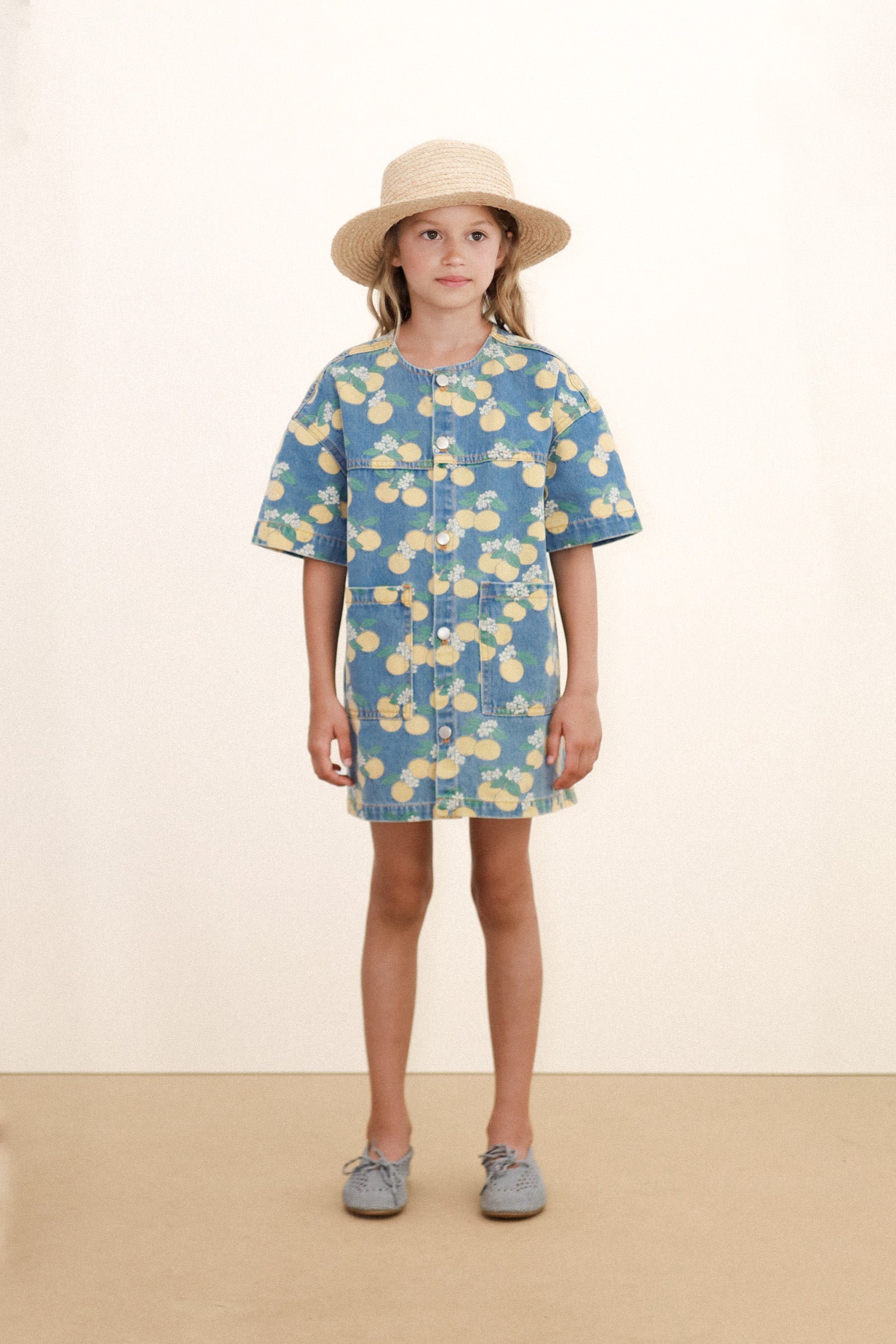 This short denim dress with an Oranges print combines freshness and fun in a versatile piece. Featuring short sleeves, a round neckline, front pockets, and a front button opening, it offers comfort and style in one look. Perfect for enjoying the day with full freedom of movement and a cheerful touch.