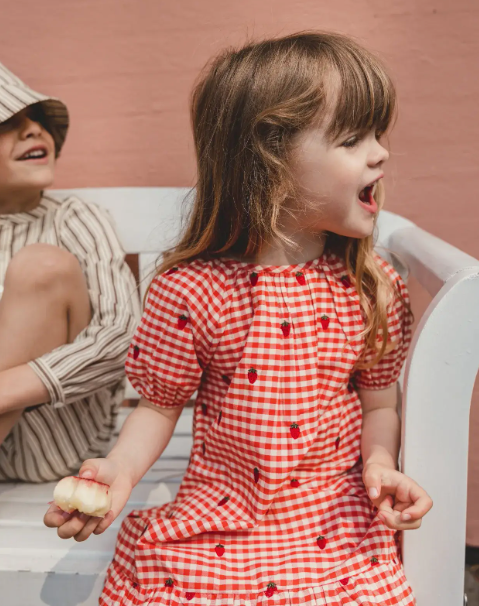 Molly Dress in gingham with strawberry embroidery. Has a ruffle on the bottom, and slightly puffed sleeves with elastic hem. Features one fabric-covered button on the back for easy dressing.