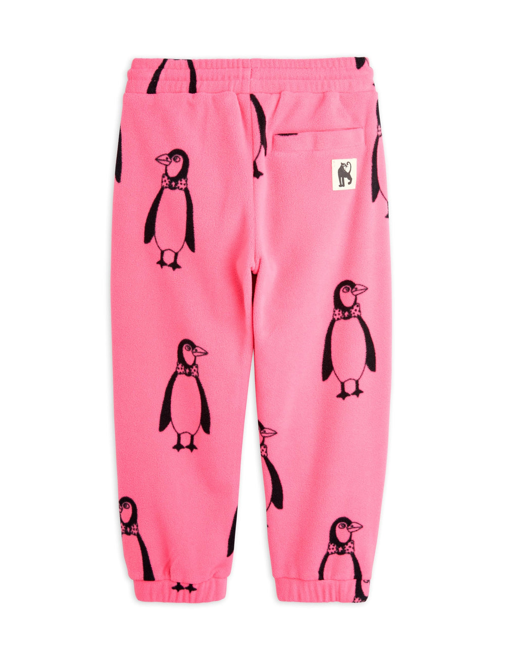 Penguin printed fleece trousers made from 100 % recycled polyester. Designed with an adjustable elastic waistband, side pockets and elastic cuffs. Decorated with a faux rear pocket with a Mini Rodini Panther patch.