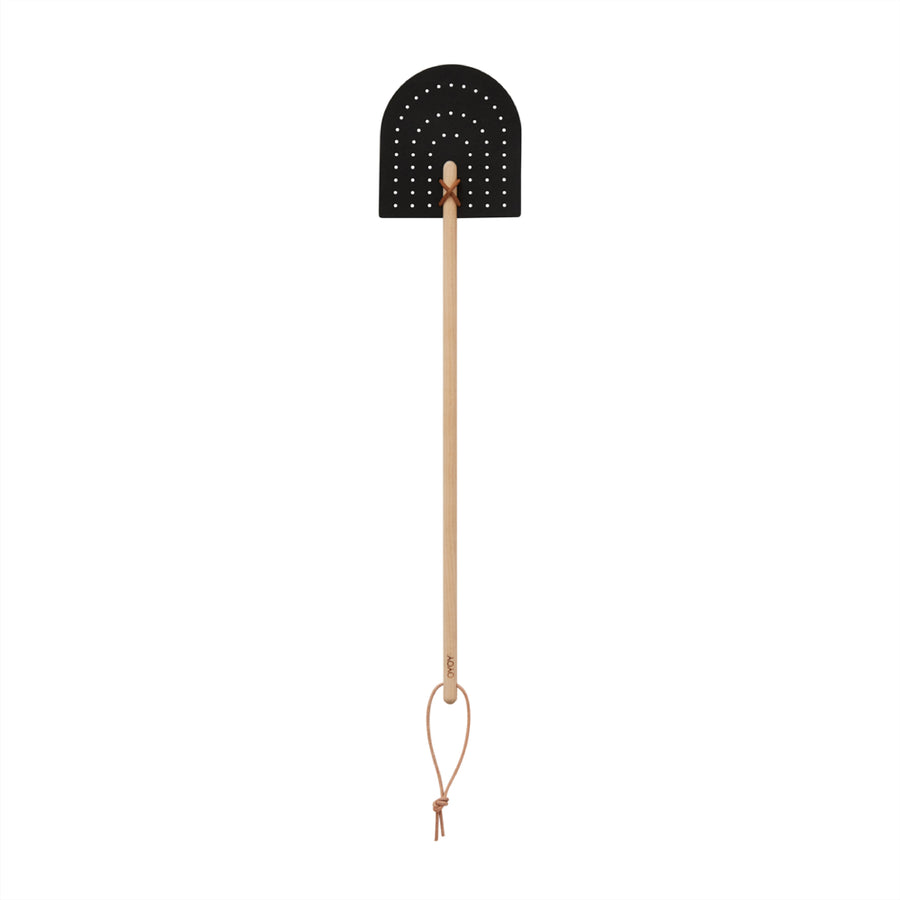 Die Rainbow-Fliegenklatsche aus Eschenholz und Silikon mit einer Lederschnur zum Aufhängen.