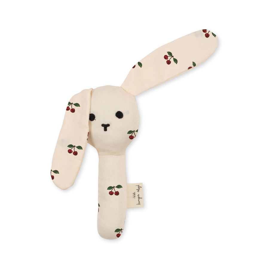 The soft rattle with a great pattern is made from organic cotton. It makes a noise when shaken. The shape of the rattle is designed so that babies can easily grasp it and develop their fine motor skills by learning to hold the rattle in one hand and then pass the toy to the other hand.
