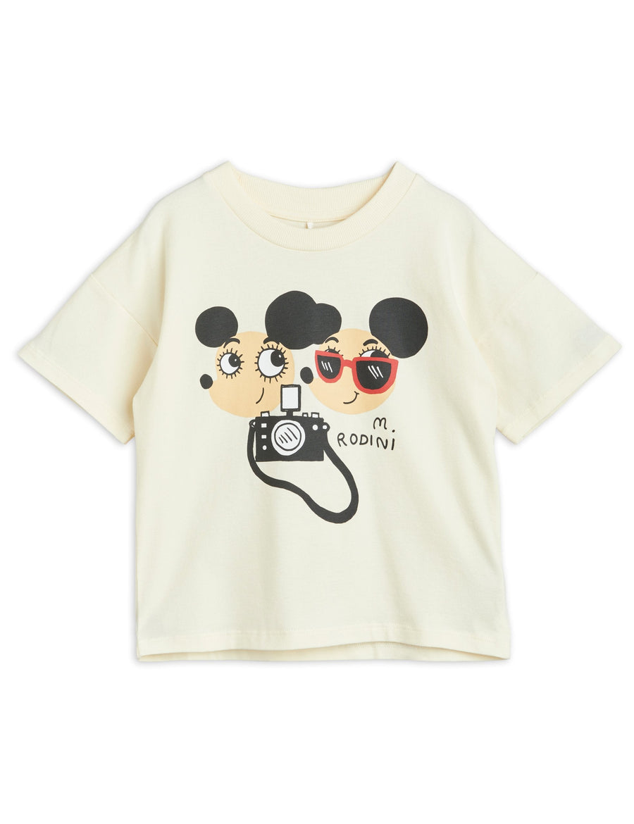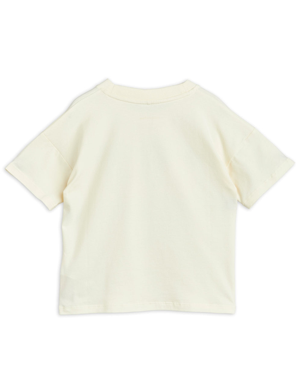 T-shirt in off-white with a large Ritzratz print made from GOTS-certified organic cotton with a touch of stretch. The t-shirt has an oversize fit with dropped shoulders and ribbed cuffs at the neck. Snaps on the shoulder in size 56/62-68/74 for easy dressing.